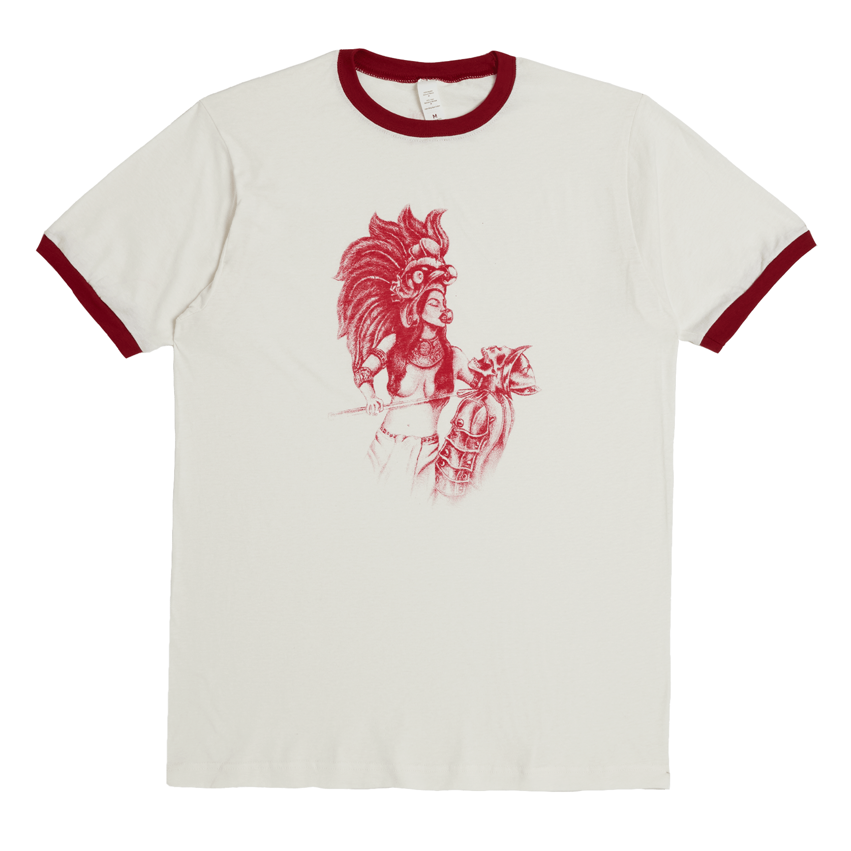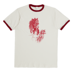 Printed on 4.5 oz off white cotton ringer tee with red trim